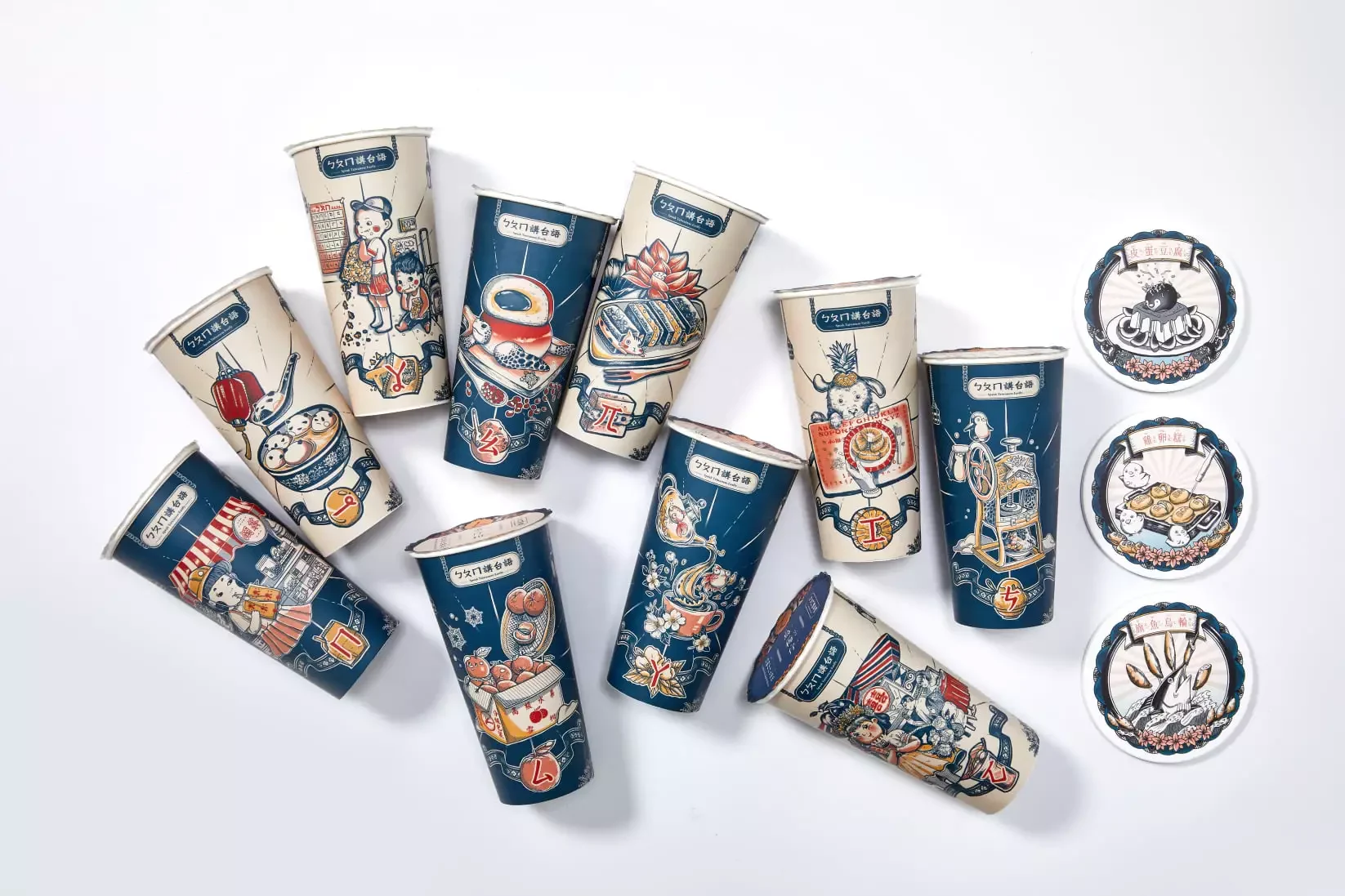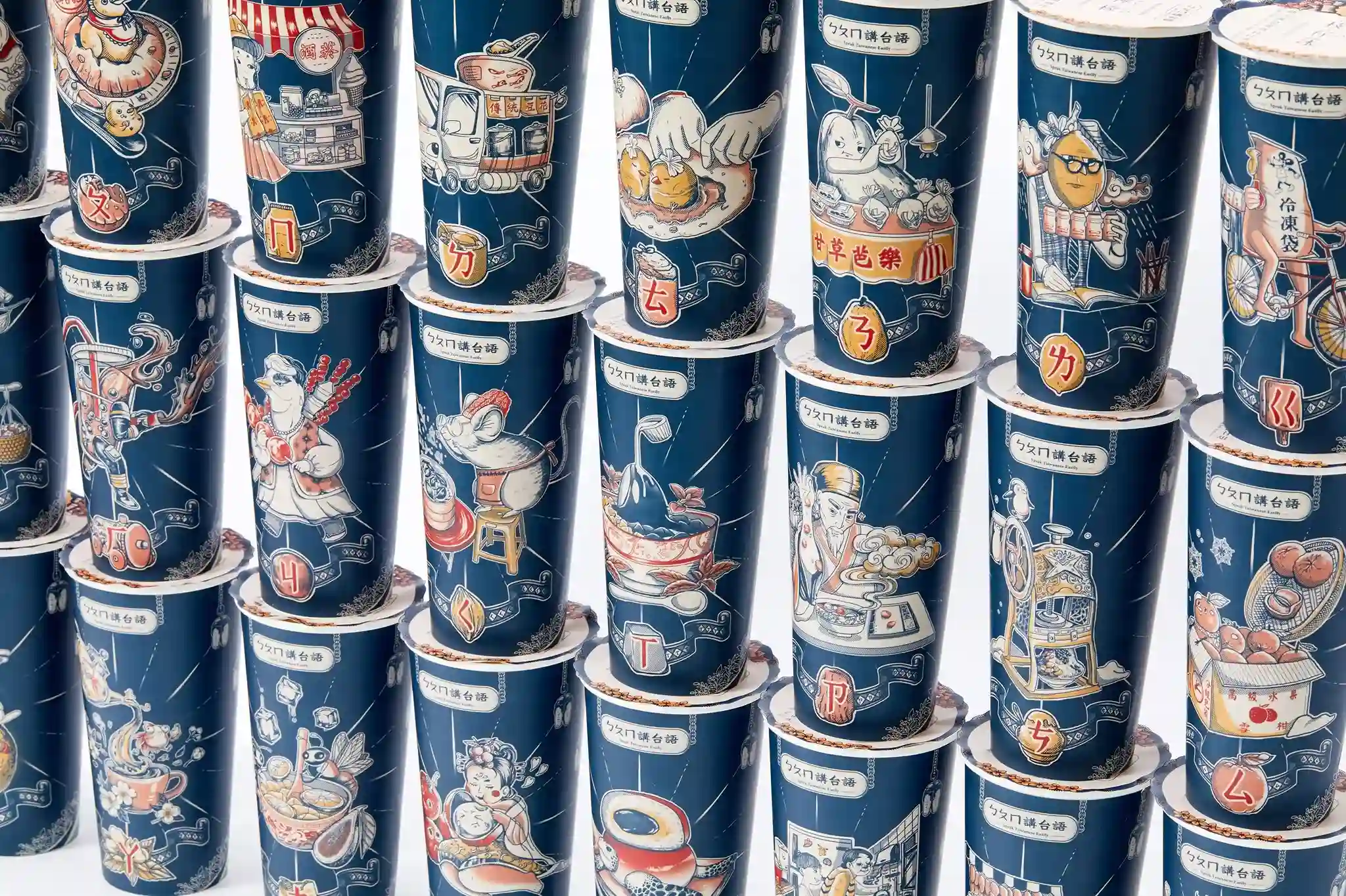 「將台語注音的專用符號,轉化為對應生活詞彙的插畫,結合年輕人日常喜愛的手搖飲包裝設計,讓他們在潛移默化中接觸並學習台語。」